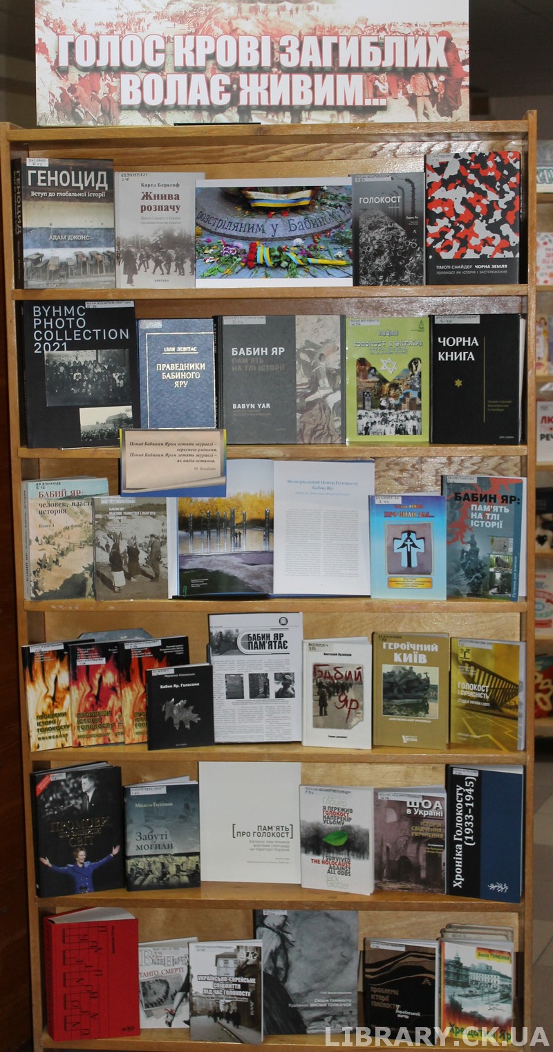 До цієї дати відділ абонемента Черкаської обласної універсальної наукової бібліотеки імені Тараса Шевченка підготував книжкову виставку «Голос крові загиблих волає живим…». На ній представлені документи, архівні джерела, спогади очевидців, історії рятівників єврейських сімей, художні твори про жахливі події того часу, доповіді на міжнародних наукових конференціях, які мають сприяти усвідомленню трагедії.