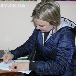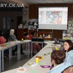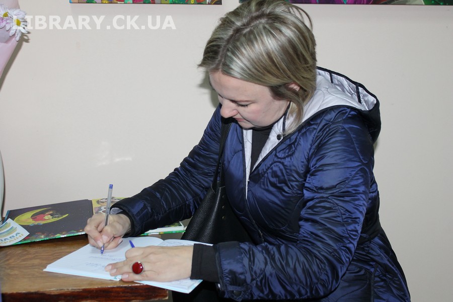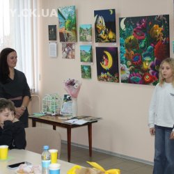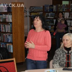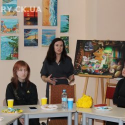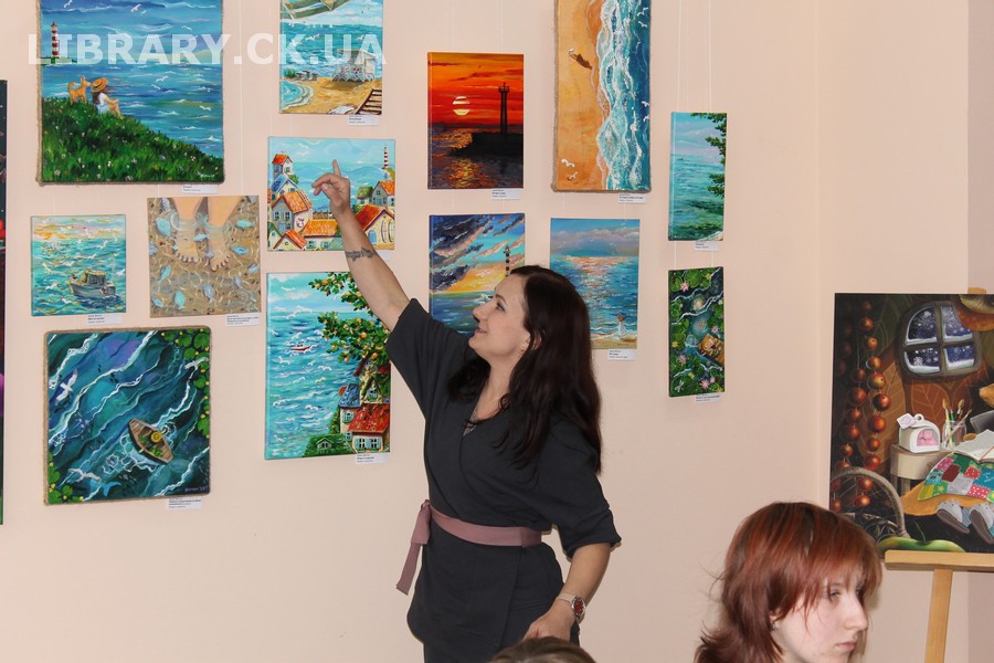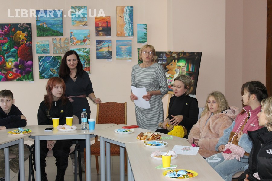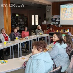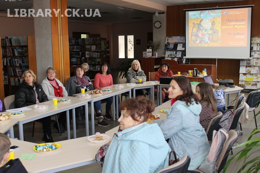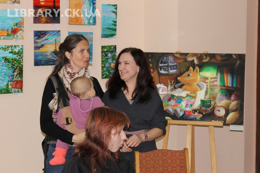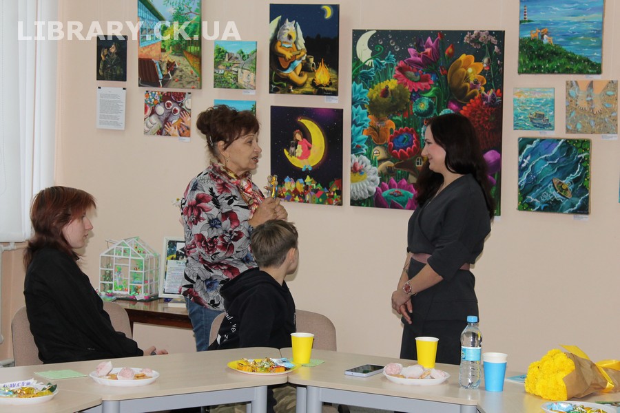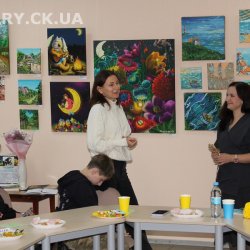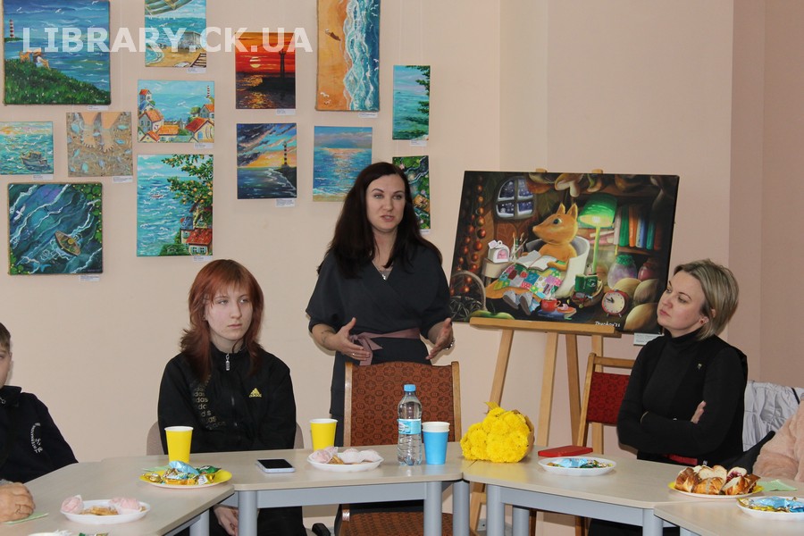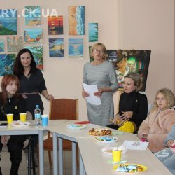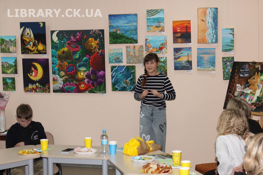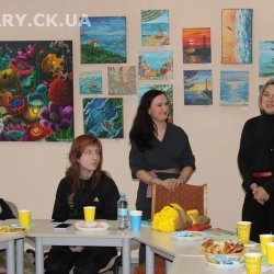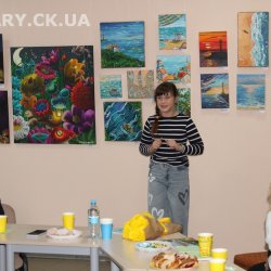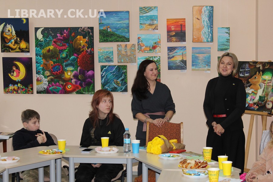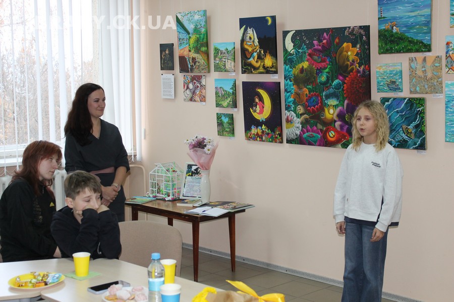 30 жовтня у Черкаській обласній універсальній науковій бібліотеці імені Тараса Шевченка панувала атмосфера затишку, доброзичливості та натхнення. Саме такою стала творча зустріч із талановитою художницею Іриною Жучок, авторкою виставки «Коли навколо ТИША». Захід розпочався із душевного чаювання зі смаколиками, що одразу наповнило простір ароматом осені, щирих розмов і справжнього людського тепла. Роботи пані Ірини вразили гостей яскравістю кольорів, глибиною відчуттів і дивовижною гармонією. Кожне її полотно – це окрема історія, де тиша говорить голосніше за слова, а фарби передають найтонші емоції. Мисткиня щиро поділилася своїм натхненням, розповіла про шлях у мистецтві, про миті, коли народжується ідея картини, і про те, як любов до краси та природи допомагає віднайти спокій і силу в тиші. За чашкою чаю лунали усмішки, добрі слова й спогади – усе те, що об’єднує людей, близьких за духом і любов’ю до мистецтва. Серед гостей були Тетяна Григоренко, старший науковий співробітник краєзнавчого музею, майстриня Лідія Солодар, художниця-ілюстраторка Наталія Клочкова, авторка оригінальних мотанок Ніна Пащенко, керівниця студії «Рапсодія» Анна зі своїми вихованицями та художниця Олена Кравцова. Усі вони прийшли не просто підтримати художницю, а й розділити з нею радість творчості, висловити вдячність і побажати нових натхненних звершень. Особливим подарунком від студії «Рапсодія» стало чуттєве читання уривку з казки Василя Симоненка «Подорож у Країну Навпаки», яке майстерно виконали Олександра Лесько та Марія Ліфер. Їхній виступ додав зустрічі добра та світла, створивши справжню атмосферу казкового дива.