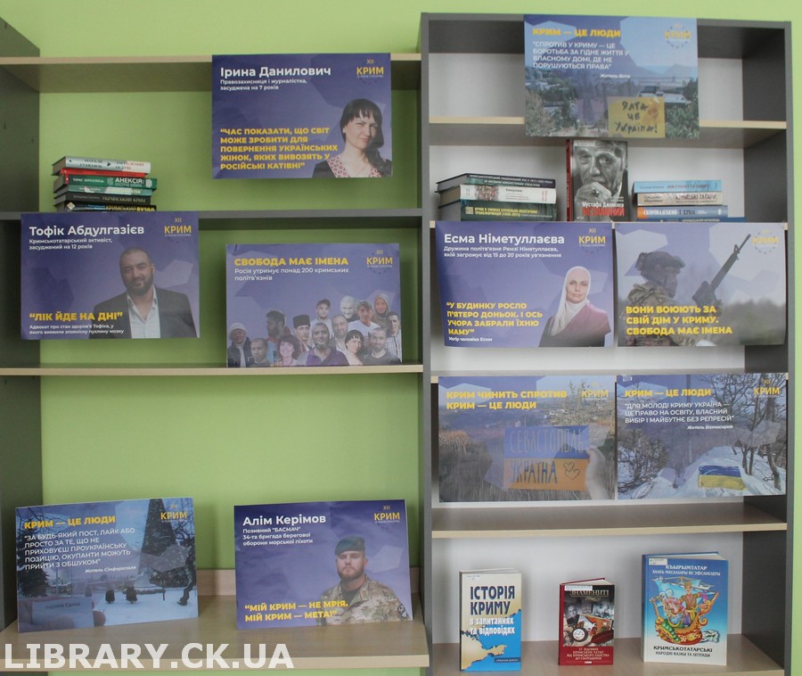 У Просторі співдії Черкаської обласної універсальної наукової бібліотеки імені Тараса Шевченка розгорнуто виставку постерів «Крим наш: спротив триває», покликану посилити інформаційну увагу до теми тимчасово окупованого півострова та боротьби його мешканців. На постерах зображені кримчани – ті, хто попри тиск і переслідування продовжує виборювати волю, свободу й право жити на рідній землі. Це історії мужності, гідності та незламності, що нагадують: спротив триває, а Крим був і залишається українським.