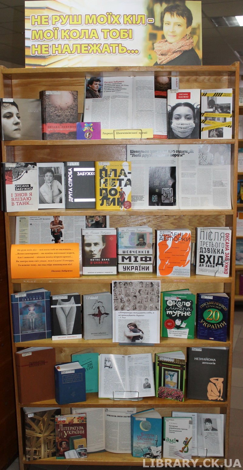 До 65-річчя від дня народження української письменниці, поетки, публіцистки, філософині та активної громадської діячки Оксани Стефанівни Забужко працівники відділу абонемента Черкаської обласної універсальної наукової бібліотеки імені Тараса Шевченка підготували виставку-портрет «Не руш моїх кіл – мої кола тобі не належать…».