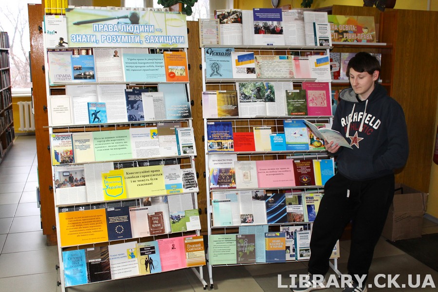 У межах Всеукраїнського тижня права, який триває із 8 по 14 грудня, працівники відділу документів з гуманітарних та природничих наук Черкаської обласної універсальної наукової бібліотеки імені Тараса Шевченка підготували інформогляд «Права людини – знати, розуміти, захищати», на якому представлено нормативно-правові акти, монографії, книги та періодичні видання, що стосуються забезпечення прав та свобод людини і громадянина в Україні, зокрема праці про соціальний захист різних категорій осіб – трудові та соціально-економічні права учасників АТО та війни, права внутрішньо переміщених осіб, людей старшого віку й дітей, питання подолання насильства в сім’ї.