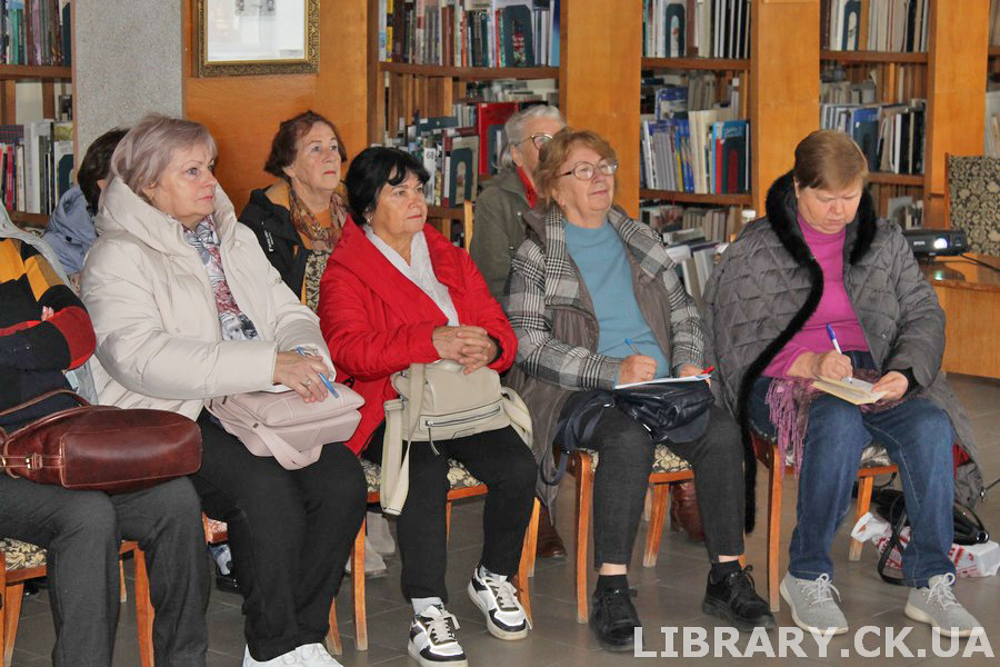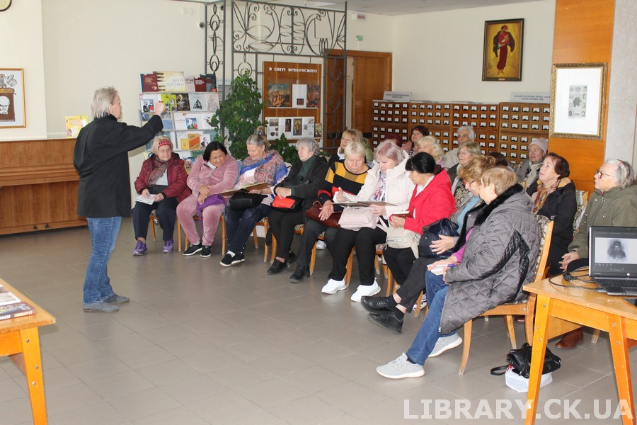 14 жовтня Черкаську обласну універсальну наукову бібліотеку імені Тараса Шевченка відвідали підопічні Територіального центру надання соціальних послуг м. Черкаси. Група студентів Університету ІІІ віку розпочала заняття з історії українського мистецтва. Першу лекцію «Тарас Шевченко – художник» для них провела завідувачка відділу мистецтв Наталія Ребякова. Вона познайомила аудиторію з тематикою та характерними рисами творчості Тараса Григоровича Шевченка, розповіла про етапи його мистецького шляху.