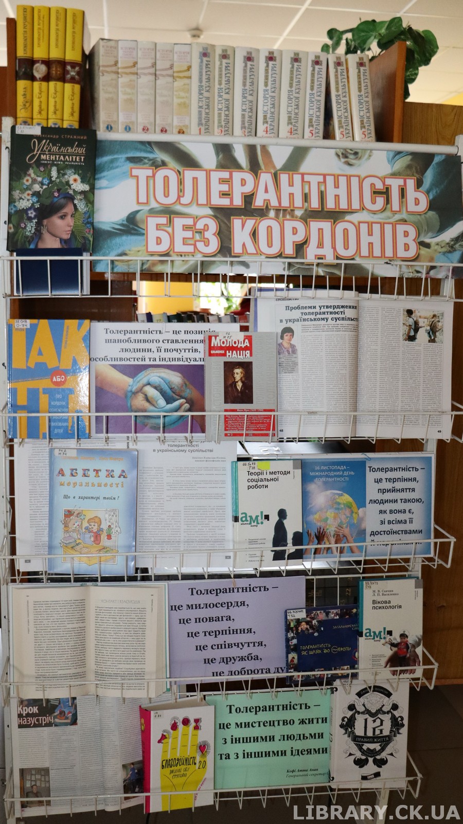Із нагоди цієї важливої дати відділ документів з гуманітарних та природничих наук Черкаської обласної універсальної наукової бібліотеки імені Тараса Шевченка підготував перегляд видань «Толерантність без кордонів». Представлені матеріали розкривають перед читачем широкий світ різноманітності: знайомлять з різними культурами, історіями та переконаннями, допомагаючи формувати відкрите та толерантне бачення світу.