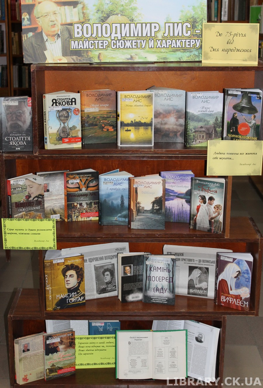 26 жовтня письменник святкує свій 75-річний ювілей. Із цієї нагоди відділ абонемента Черкаської обласної універсальної наукової бібліотеки імені Тараса Шевченка підготував виставку-пошану «Володимир Лис – майстер сюжету й характеру», яка знайомить читачів із багатющим творчим доробком майстра.