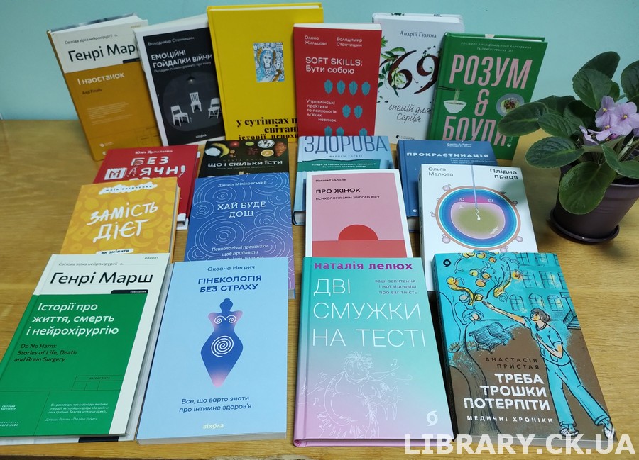 Черкаська обласна універсальна наукова бібліотека імені Тараса Шевченка отримала від Благодійного фонду «Бібліотечна країна» цінний комплект літератури в межах проєкту «Здорові бібліотеки». До нашого фонду надійшла добірка сучасних і важливих видань, присвячених психологічному здоров’ю, тілесності, мотивації та підтримці. Ці книги стануть не лише джерелом знань, а й інструментом, що допоможе нам створювати безпечний, чутливий і турботливий простір для наших користувачів.
