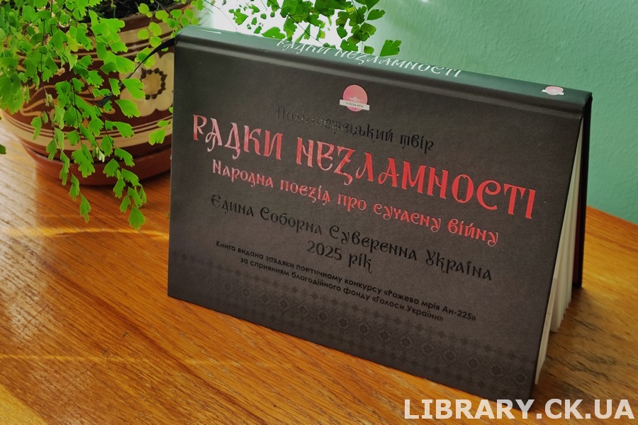 Ще одним унікальним виданням збагатився фонд Черкаської обласної універсальної наукової бібліотеки імені Тараса Шевченка. Це поетична антологія «Рядки незламності», що побачила світ за підсумками Всеукраїнського народного поетичного конкурсу «Рожева мрія. Ан-225» та за сприяння благодійного фонду «Голоси України». Ця книга стала знаковою подією в сучасній українській літературі. До антології увійшли найкращі поетичні твори про російсько-українську війну, створені як відомими українськими поетами, так і літераторами-початківцями та тими, хто несподівано відкрив у собі поетичний дар у дні тяжких випробувань. Особливу цінність книзі надають рідкісні світлини та журналістські замальовки, що чуттєво та правдиво відображають різні аспекти цієї жахливої, нелюдської війни: руйнування міст, біль втрат, трагедію переселенців, страждання полонених, подвиг волонтерів та щоденний героїзм українців. Поезія антології охоплює нову реальність: повітряні тривоги й братські могили, боротьбу, сльози, незламність. Ця книга народжена з болю, тривоги та любові до України –держави, яка вкотре постала проти руйнівної демонічної сили, що століттями намагалася знищити наш народ. Сьогодні ми переживаємо кульмінаційний момент цієї боротьби – і ми обов’язково переможемо!