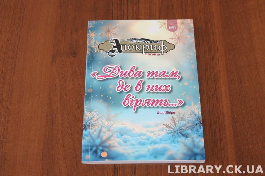 Черкаська обласна універсальна наукова бібліотека імені Тараса Шевченка отримала в дарунок від видавництва «ІнтролігаТОР» черговий випуск літературно-мистецького часопису «Апокриф». Видання побачило світ за сприяння Черкаської обласної організації «Громадська організація людей з обмеженими можливостями «День». Часопис познайомить шанувальників українського слова з талановитими юними та зрілими авторами художнього слова, митцями, науковцями, краєзнавцями, композиторами й художниками. На його сторінках – патріотична й лірична поезія, сучасна проза, краєзнавчі та наукові розвідки, а також пізнавальні нариси про життя і творчість відомих українських митців. «Апокриф» є простором живого діалогу, де поєднуються різні покоління, жанри й творчі голоси.